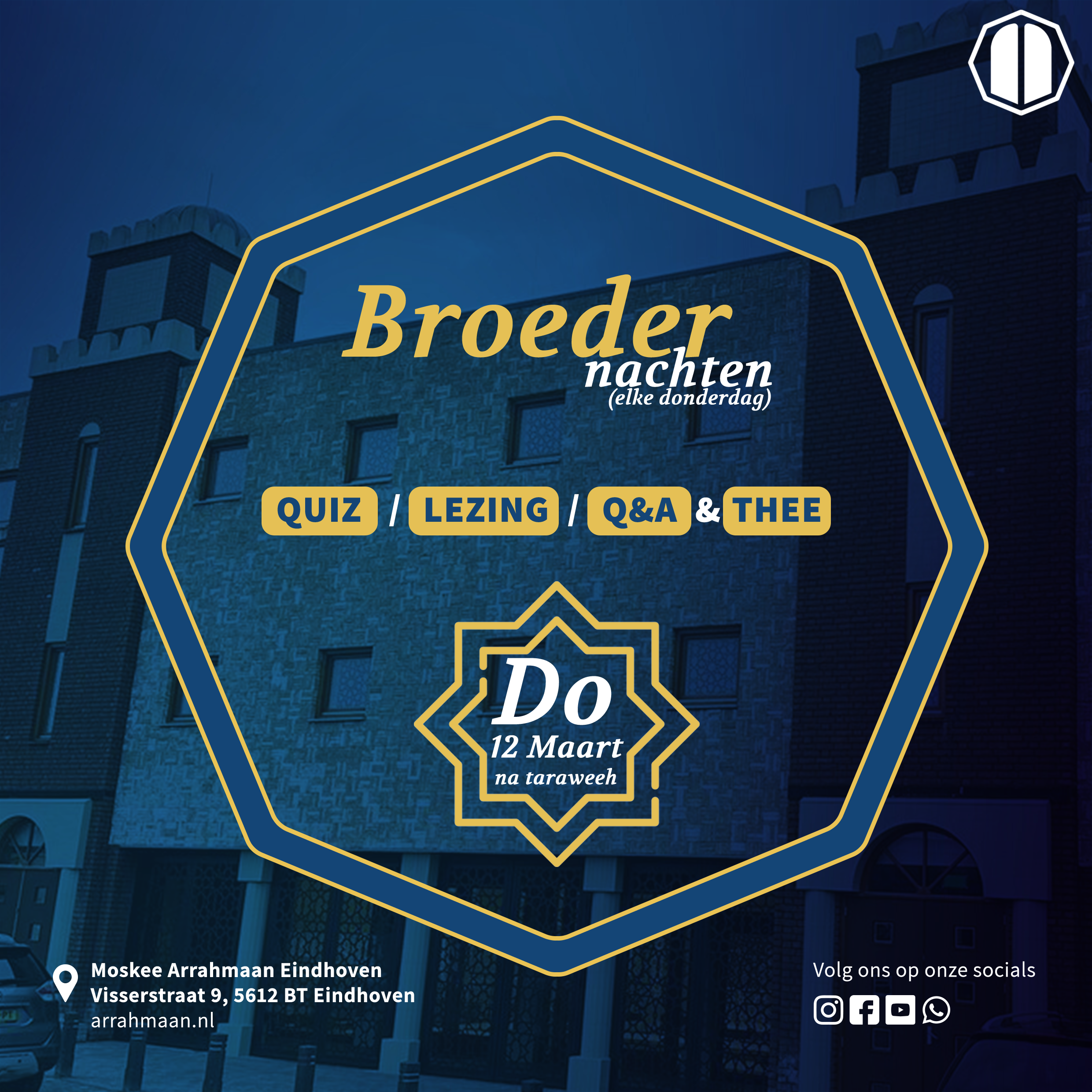 Na het succes van voorgaande jaren organiseren wij ook dit jaar gedurende de hele maand Ramadan iedere donderdagavond na het taraweeḥ-gebed onze broedernachten. Deze nachten staan in het teken van kennis, reflectie en gezelligheid, waarbij we elkaar beter leren kennen en samen stilstaan bij de bijzondere betekenis van deze gezegende maand. Onder het genot van Marokkaanse thee en iets lekkers is er ruimte voor ontmoeting, verbinding en verdieping.